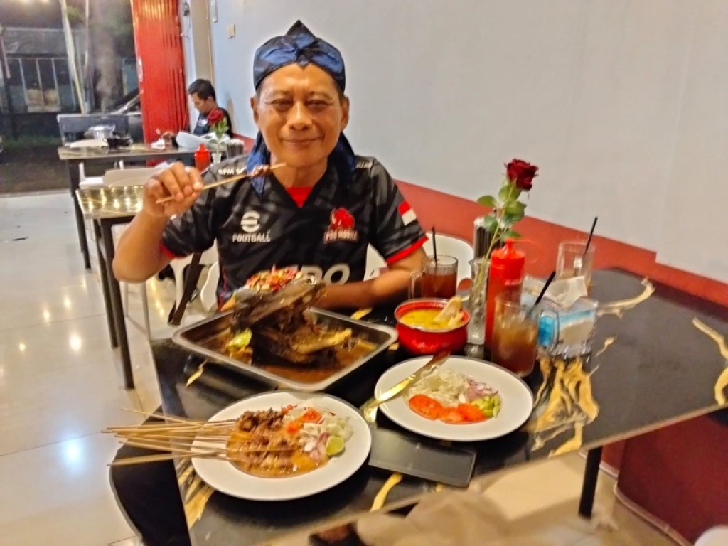 Seorang pelanggan Faifood sate gule dan kepala Kambing di Gresik. ((foto: ali/ B-news.id)