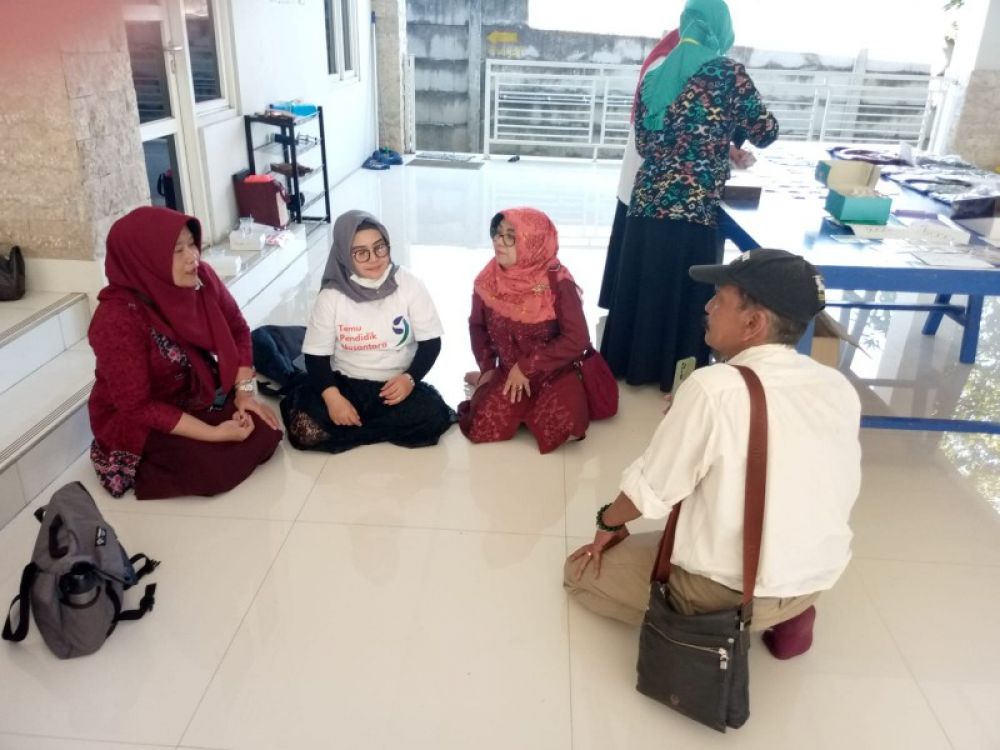 Salah satu peserta sangat antusias berdiskusi dengan Umi Hasanah (kaos putih) pemateri Menerjemahkan CP dan ATP untuk Pembelajaran Kontekstual. (ram)