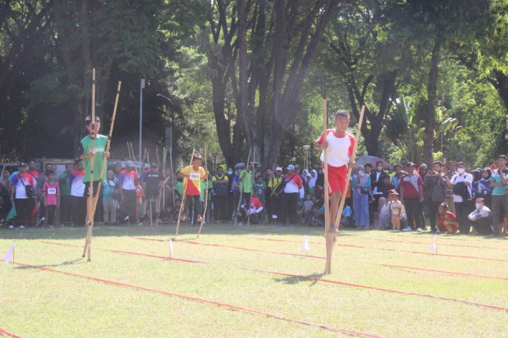 BOJONEGORO | B-news.id - Memperingati Hari Ulang Tahun (HUT) Ke-77 Kemerdekaan Republik Indonesia (RI), Dinas Pendidikan Kabupaten Bojonegoro melalui Kelompok Kerja Guru Pendidikan Jasmani Olahraga dan Kesehatan Sekolah Dasar (KKG PJOK SD) menggelar Lomba Dangongan dan Engrang. Lomba Olahraga Tradisional ini digelar di Alun-alun Bojonegoro, Selasa (9/8/2022).