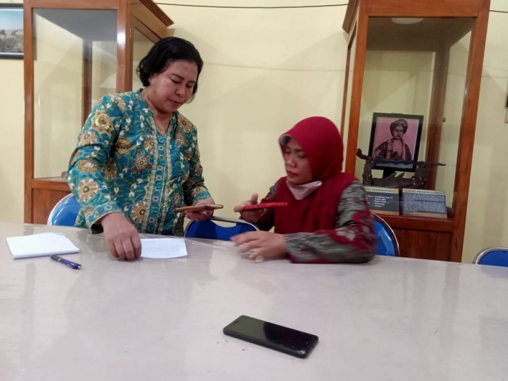 Suzana (kemeja batik) penilik pendidikan di Kecamatan Kutorejo korban dugaan penipuan bersama YunaniYunani, seorang prndidik SMA Begeri Sooko Kabupaten Mojokerto. (ram)