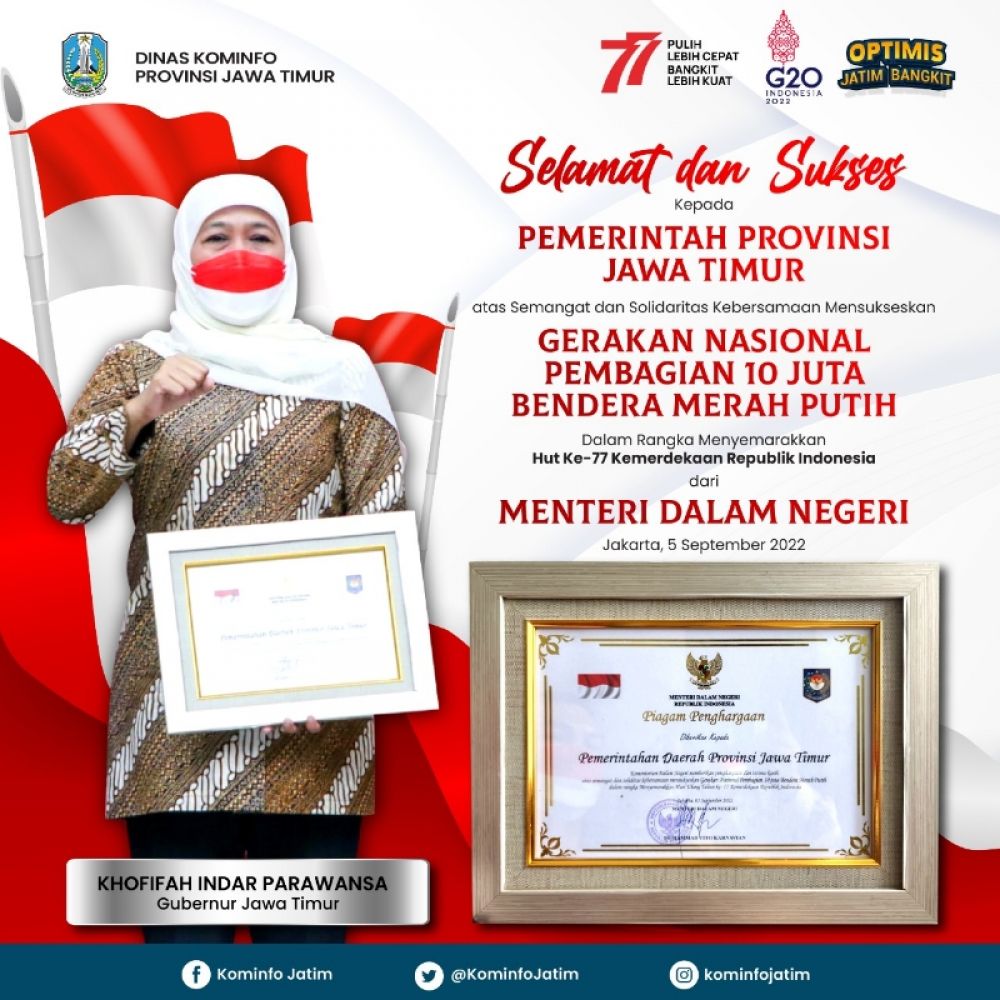 JAKARTA | B-news.id - Pemerintah Provinsi Jawa Timur mendapatkan penghargaan dari Kementerian Dalam Negeri (Kemendagri) usai mendukung Gerakan Nasional Pembagian 10 Juta Bendera Merah Putih yang dicanangkan Menteri Dalam Negeri Tito Karnavian pada peringatan jelang HUT Ke-77 Kemerdekaan RI.