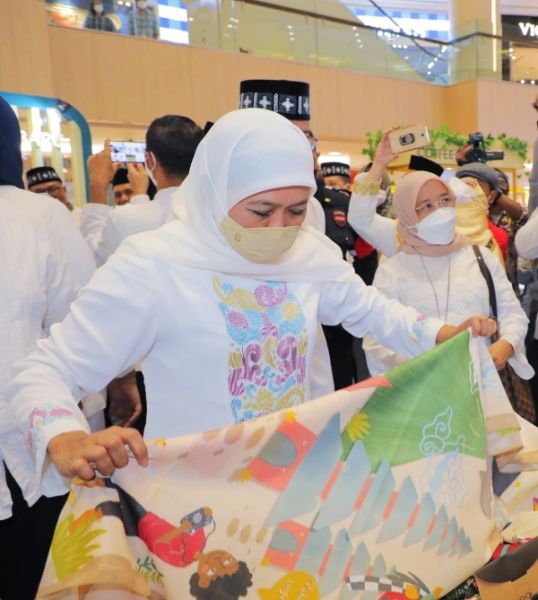 Gubernur Khofifah saat memilih batik produk UMKM. (Ist)