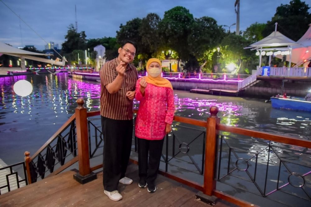 Kepada orang tua yang mendampingi beberapa orang dari mereka, Gubernur Khofifah menyampaikan bahwa wisata perahu kalimas, sangat cocok dinikmati malam hari.
