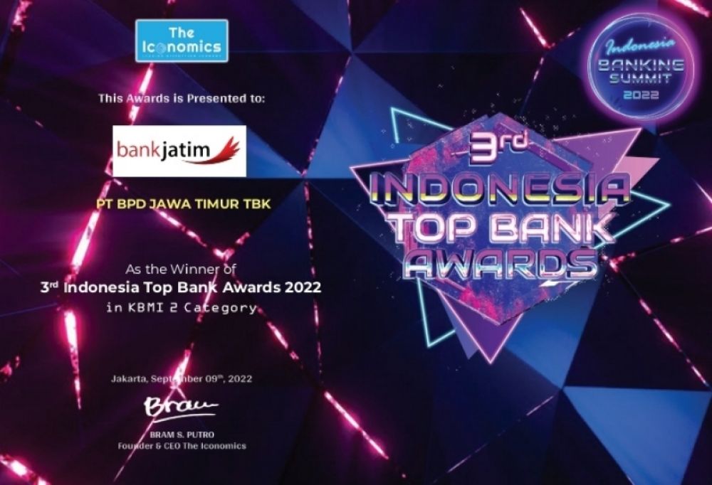 JAKARTA | B-news.id - PT Bank Pembangunan Daerah Jawa Timur Tbk (bankjatim) mengawali bulan September secara gemilang dengan berhasil meraih prestasi dalam acara “3rd Indonesia Top Bank Awards 2022” yang diselenggarakan oleh The Iconomics pada Jumat, (09/08/2022).