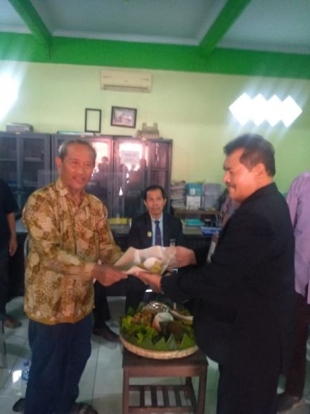 Ketua KPRI Ustadzi Rois menyerahkan potongan tumpeng kepada pengacaranya. (foto: ram)