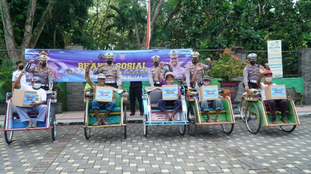 Para abang becang terlihat sumringah setelah menerima bantuan paket sembako dari Polres Blitar. (Ist)