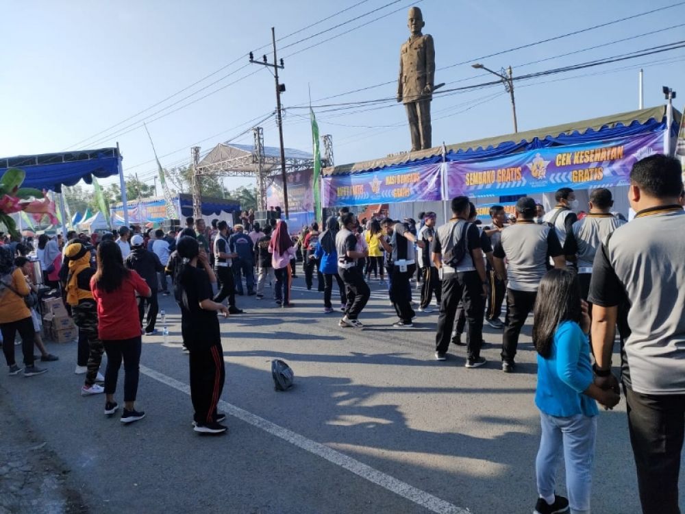 "Disini ada fasilitas pemeriksaan kesehatan gratis, pembagian sembako gratis, pembagian sayur dan bahan pokok lainnya juga gratis, kita juga membagikan makanan gratis, ada pecel, ada nasi goreng, mie goreng, kami juga mengadakan dapur lapangan gratis. Jadi yang melaksanakan masak itu dari polwan kami dan dari polisi lalu lintas yang memasak gratis untuk masyarakat." kata Kapolres.