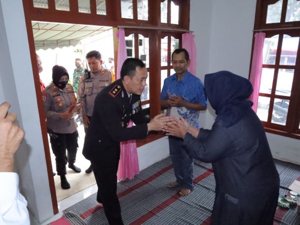 Keadatabga Kapolres Blitar AKBP Adhitya Panji Anom diterima hangat ibu korban saat akan menyerahkan santunan. (Ist)