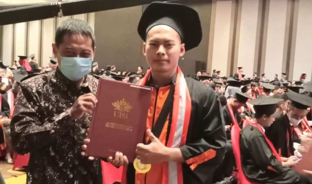Salah satu mahasiswa UISI asal Gresik usai mengikuti prosesi wisuda di hotel Aston Inn Gresik. (Ist)