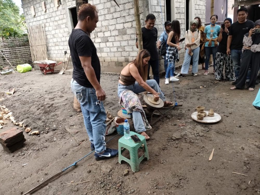 Salah satu wisatawan tertarik membuat kerajinan dari tanah liat. (Ist)