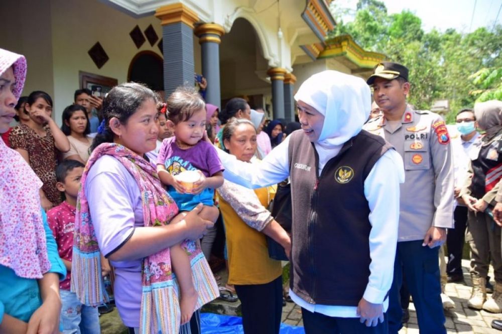 Gubernur Khofifah menyambangi warga yang terdampak longsor dan menyerahkan bantuan. (Ist)