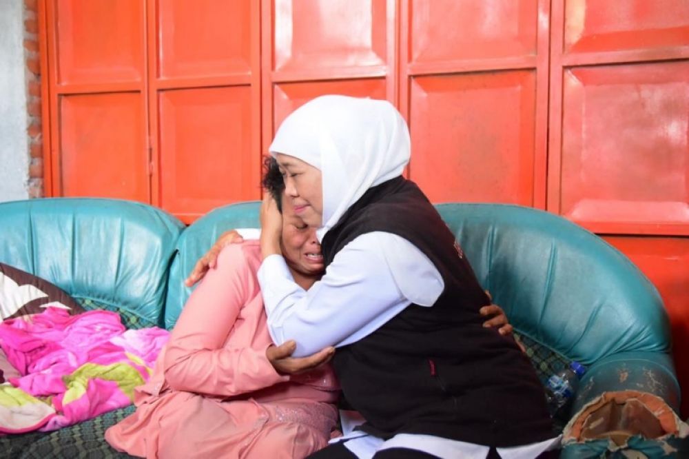 Gubernur Kihofifah memeluk warga Dusun Pale Desa Sumurup yang rumahnya hancur terkena lonngsor. (Ist)