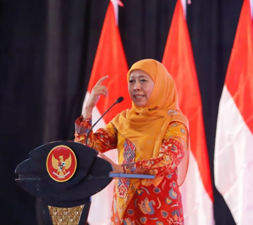 Gubernur Jawa Timur Khofifah Indar Parawansa menyampaikan sambutan dalam acara Misi Dagang dan Investasi Perdana Jatim - Aceh di hotel Amel Conventoon Hall Aceh. (Ist)