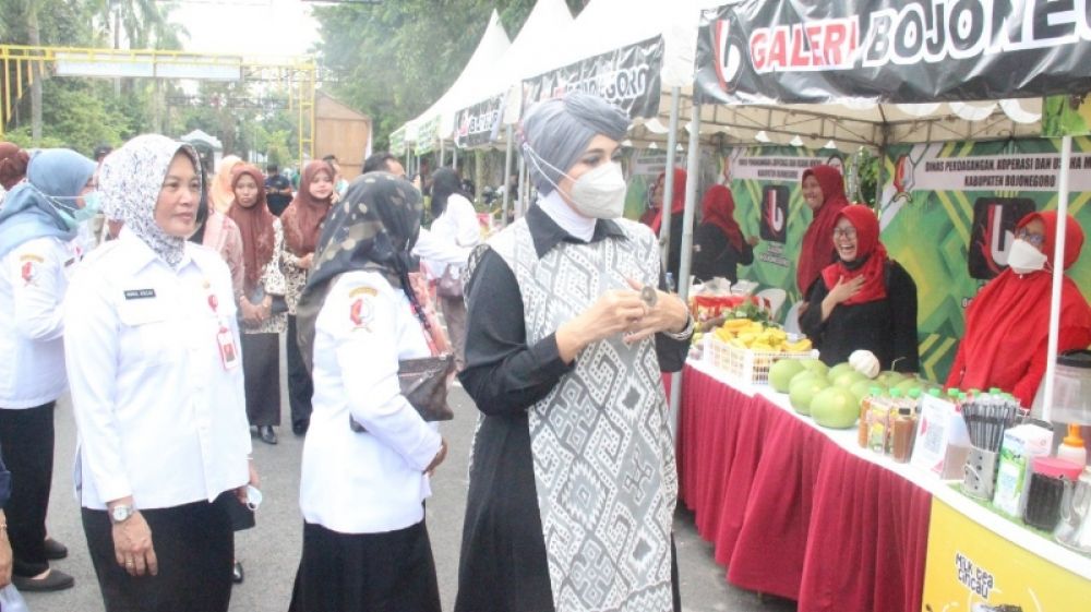 Dr Lula Kamal saat meninjau stand makanan lokal Bojonegoro dalam event Talkshow GETUK PARASA. (Ist)