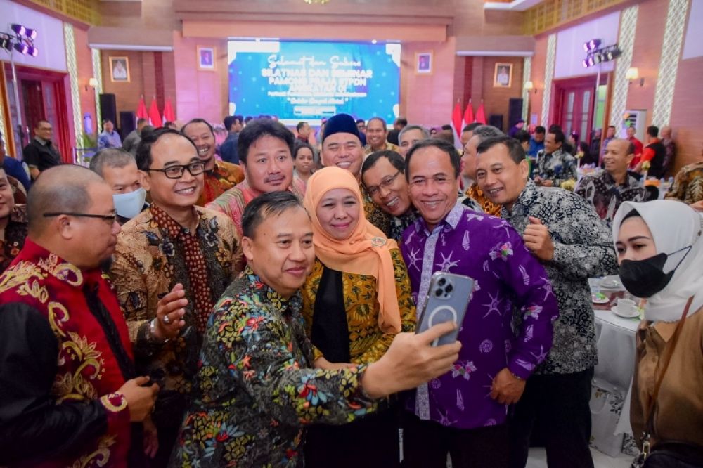 Peserta Silatnas dan Senmas Pamong Praja STPDN 01 saat berselfi dengan gubernur Khofifah. (Ist)