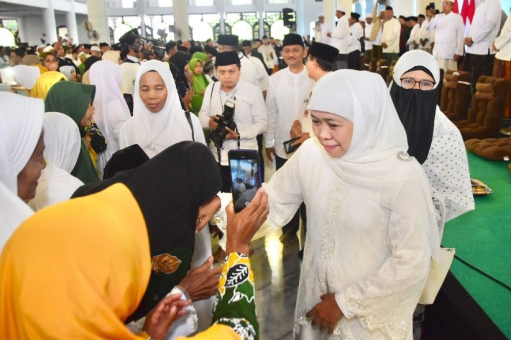 Gubernur Khofifah menyalami para janaah. (Ist)