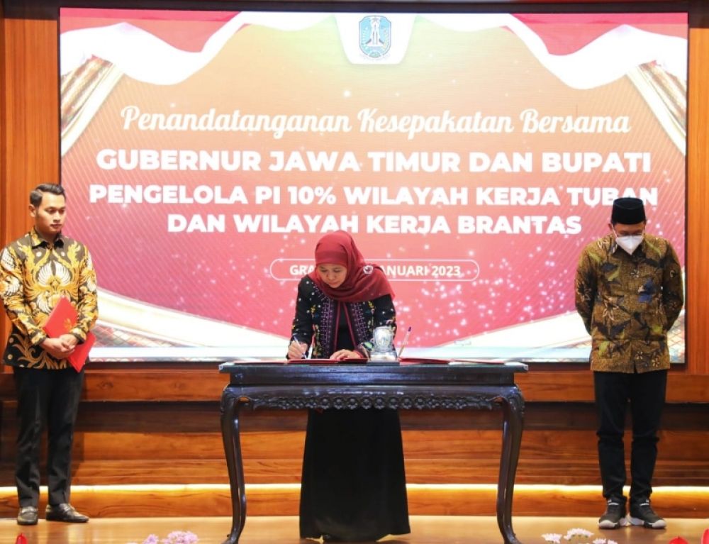 SURABAYA | B-news.id - Gubernur Jawa Timur Khofifah Indar Parawansa menandatangani kesepakatan bersama terkait pengelolaan Participating Interest (PI) 10 % minyak dan gas bumi (Migas) untuk Wilayah Kerja (WK) Tuban serta WK Brantas di Gedung Negara Grahadi, Surabaya, Selasa (3/1) malam.