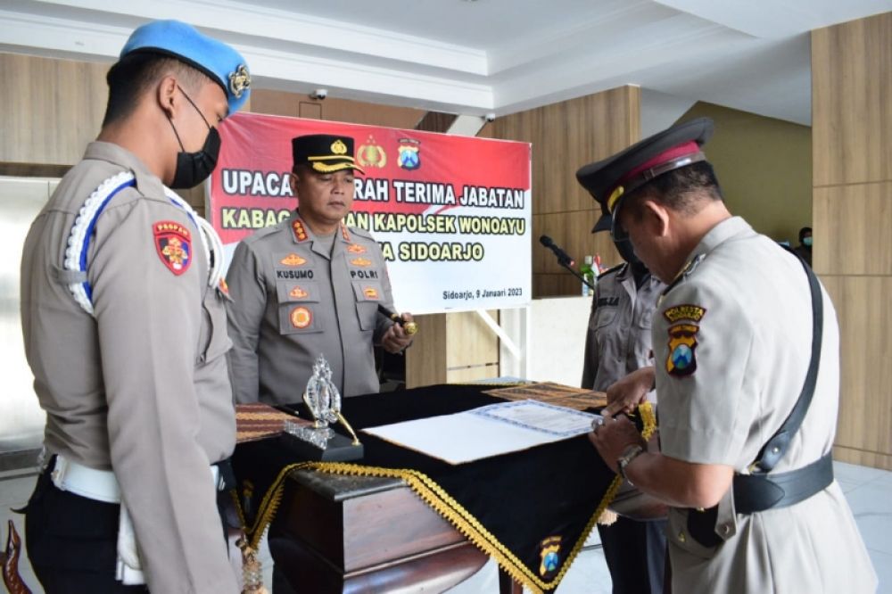 SIDOARJO | B-news.id - Kapolresta Sidoarjo Komisaris Besar Polisi Kusumo Wahyu Bintoro, Senin (9/1/2023) pagi, memimpin upacara serah terima jabatan (sertijab) Kabag Ops Polresta Sidoarjo dan Kapolsek Wonoayu.