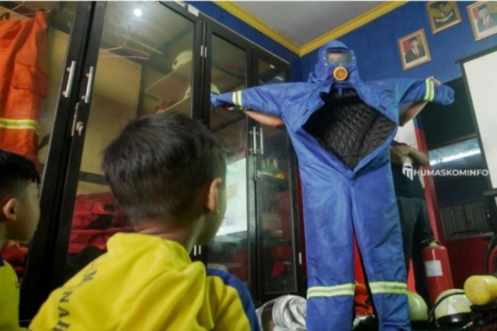 Selain memberikan materi tentang penanggulangan dan pencegahan kebakaran, petugas juga mengenalkan beberapa alat pemadam kebakaran dari berbagai skala.