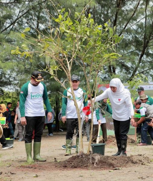 Didampingi Deputi Bidang Koordinasi Pengelolaan Lingkungan dan Kehutanan Kemenko Marvest Nani Hendiarti dan Bupati Sidoarjo Ahmad Muhdlor Ali, Gubernur Khofifah memimpin langsung penanaman 1.000 bibit mangrove dan bibit pohon produktif.