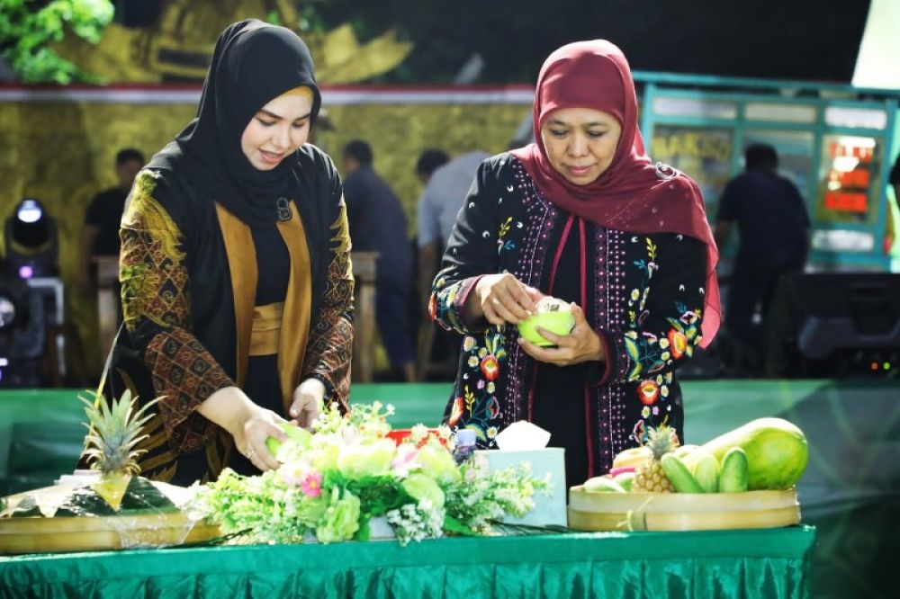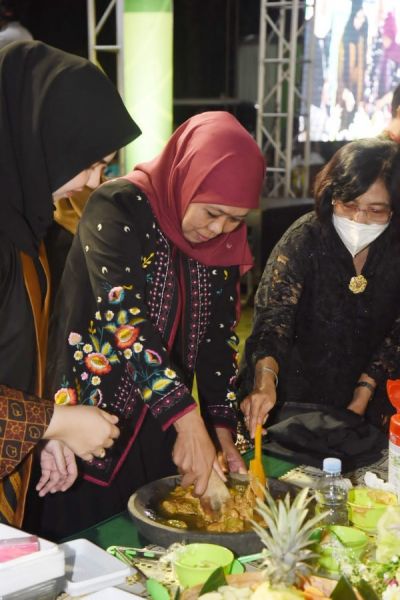 Pada kesempatan yang sama, pemandangan menarik terlihat saat Gubernur Khofifah ikut mengulek Rujak Erok Erok makanan khas dari Kota Probolinggo.