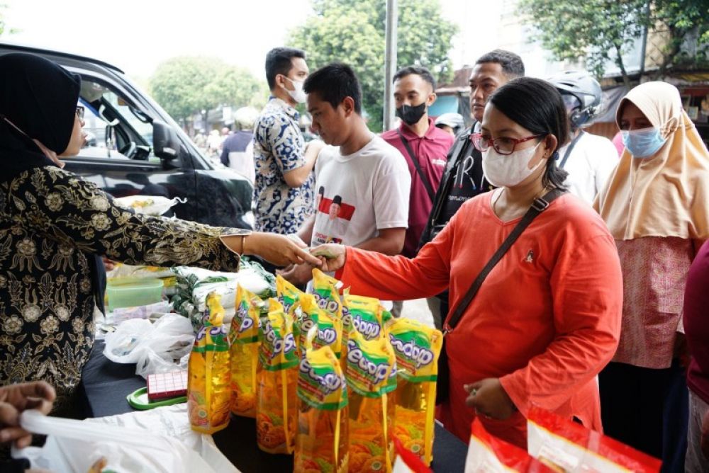 Warga Kota Mojokerto antusias mendatangi kios Diskopukmperindag Kota Mojokerto yang buka di pintu masuk Pasar Tanjung Anyar (ist)