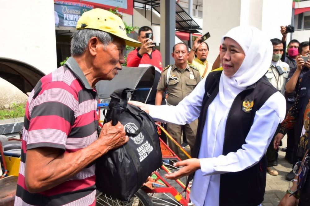 Seorang tukang becak menerima bantuan sembako dari Gubernur Khofifah. (Ist)