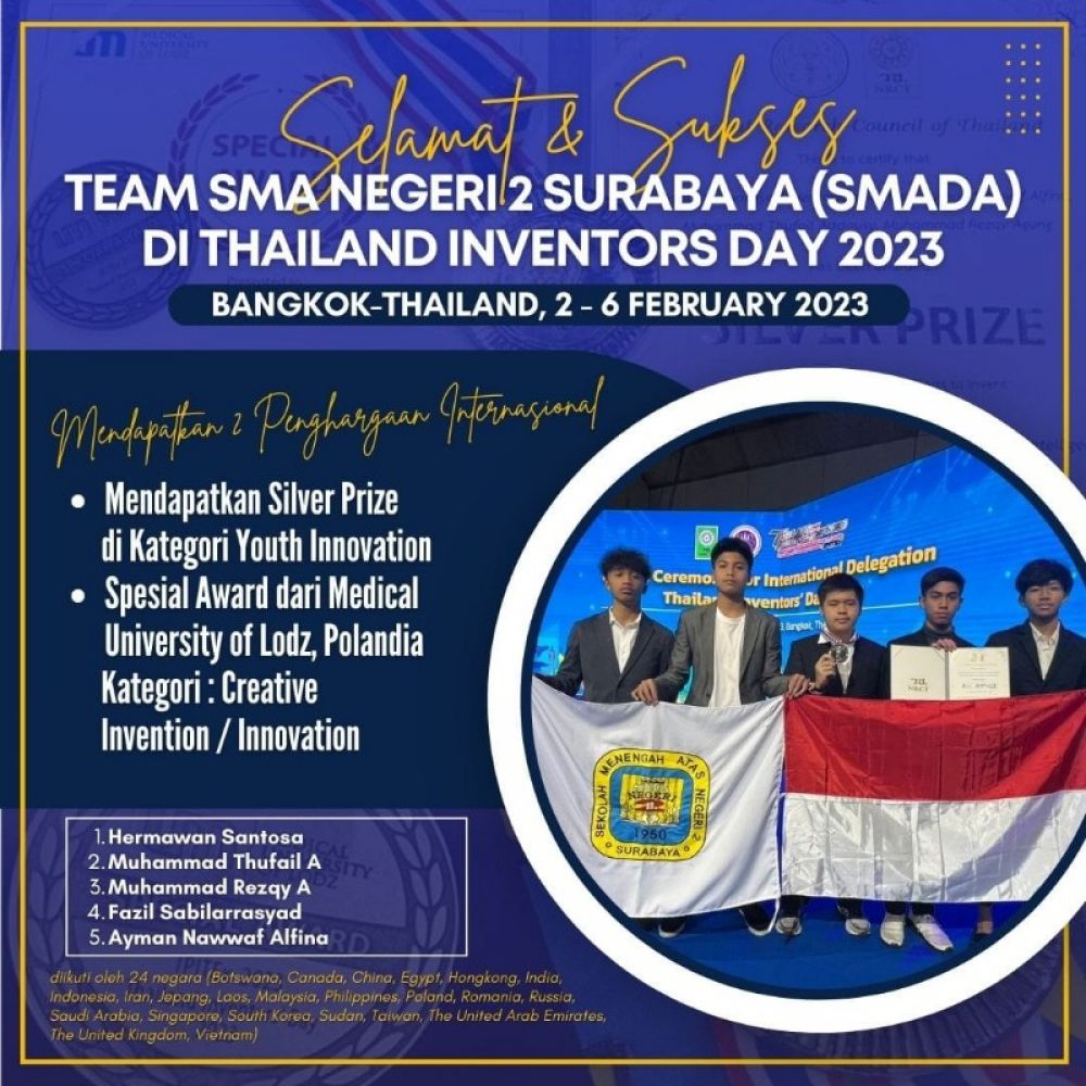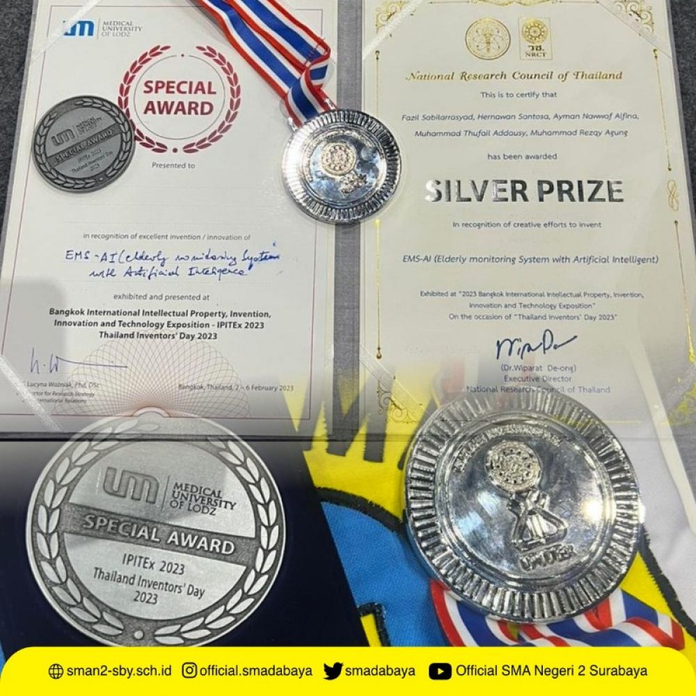 SURABAYA | B-news.id -Prestasi gemilang berhasil ditorehkan lima siswa SMA Negeri 2 (SMADA) Surabaya dalam ajang Bangkok International Intellectual Property, Invention, Innovation and Technology Exposition (IPITEx). Melalui inovasinya berupa Elderly Monitoring System With Artificial Intelligence (EMS-AI), lima siswa asal Jawa Timur tersebut berhasil mengantongi dua penghargaan sekaligus.