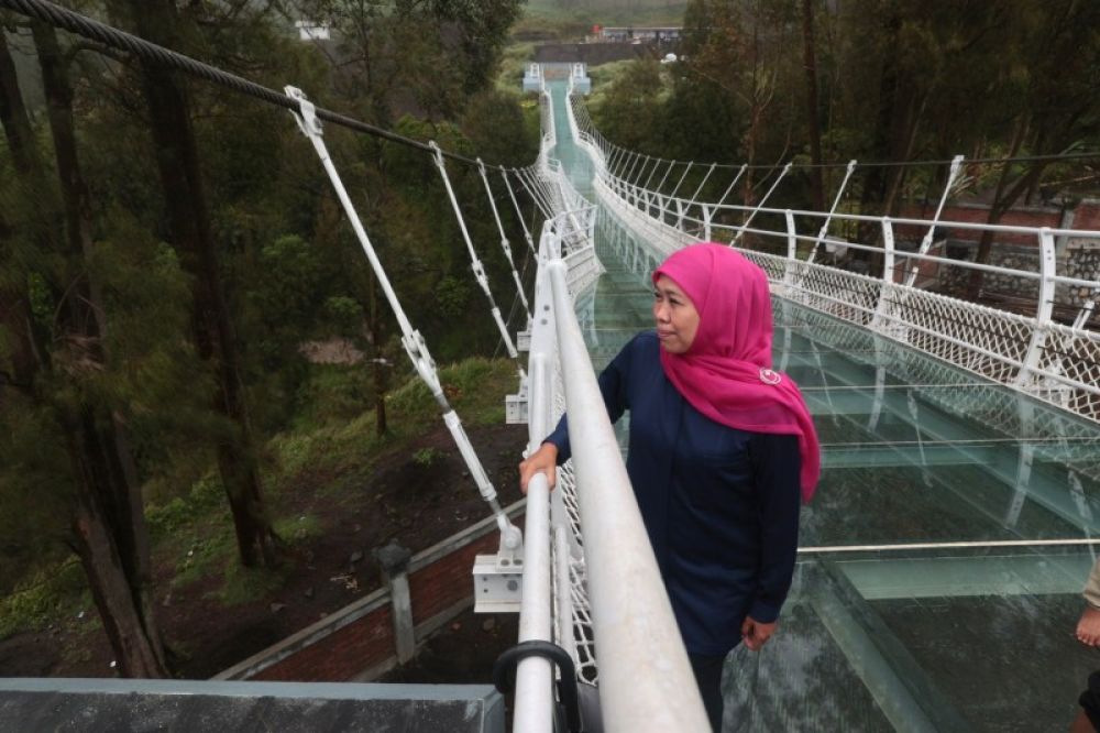 Setelah mencoba melintasi Jembatan Kaca yang membentang di atas jurang berkedalaman 80-100 meter tersebut, Gubernur Khofifah menyatakan rasa bangganya atas rampungnya Jembatan Kaca tersebut yang merupakan karya anak bangsa.