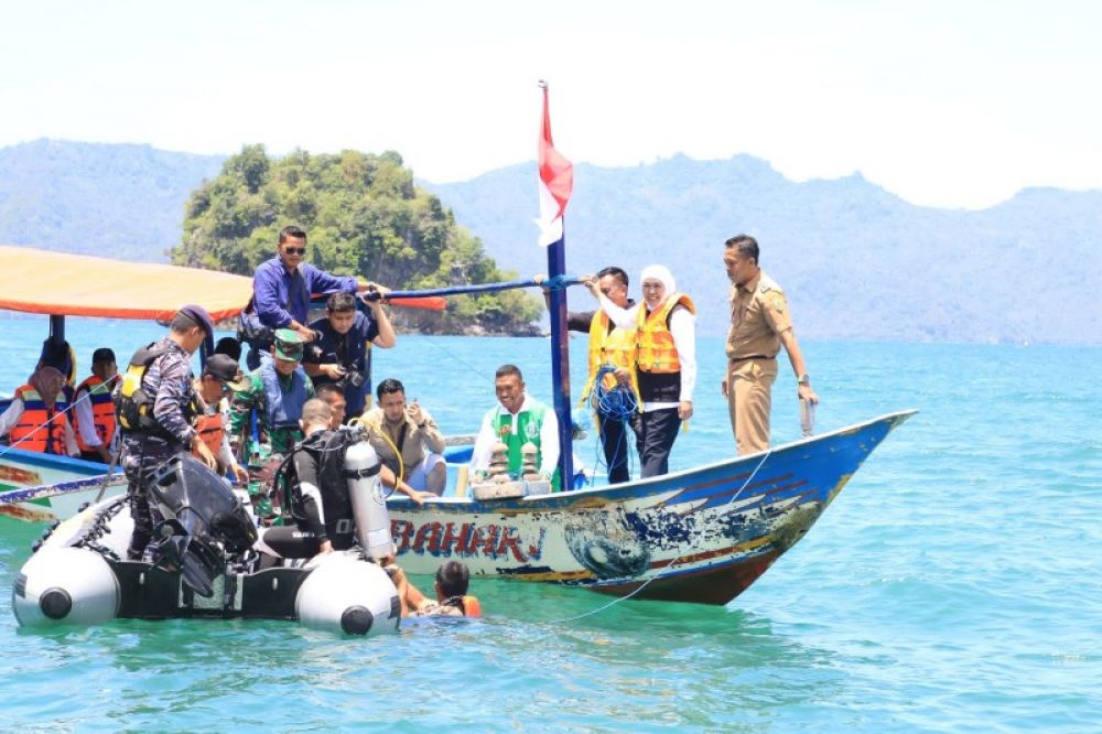 Proses penanaman terumbu karang pun berjalan lancar dengan Cak Ipin sapaan akrabnya menyelam untuk meletakkan media tanam yang telah disiapkan oleh Gubernur Khofifah.