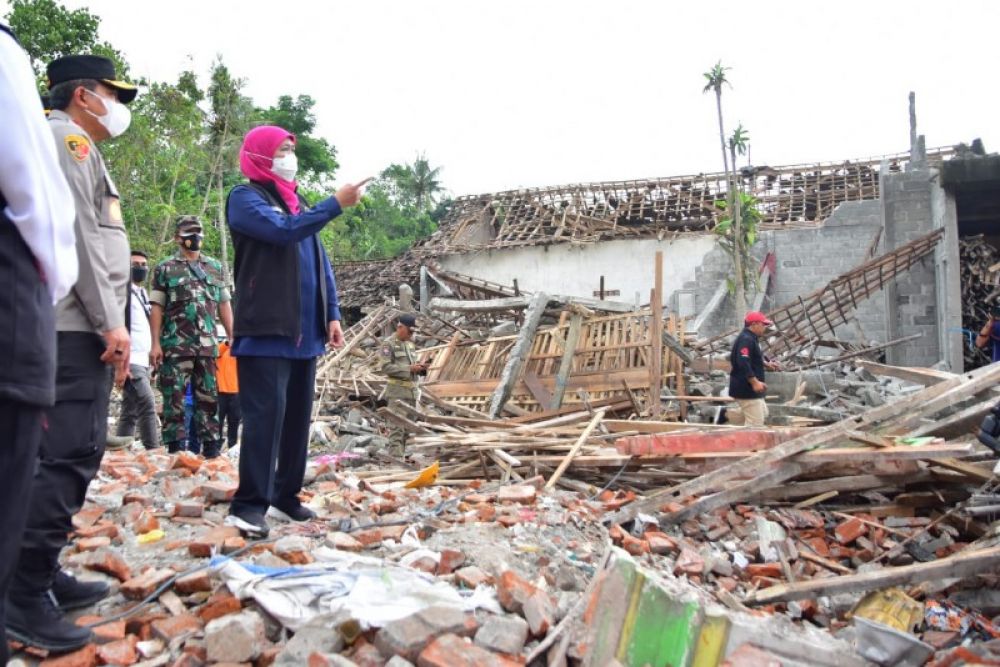 Gubernur Khofifah bersama aparat keamanan meninjau lokasi ledakan petasan di Blitar. (Ist)
