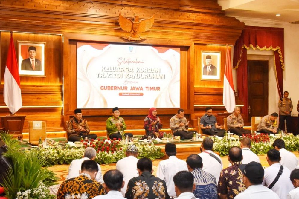 SURABAYA | B-news.id - Gubernur Jawa Timur Khofifah Indar Parawansa menggelar silaturahmi dan tahlil bersama dengan keluarga korban tragedi Kanjuruhan Malang di Gedung Negara Grahadi Surabaya, Kamis (2/3) malam.
