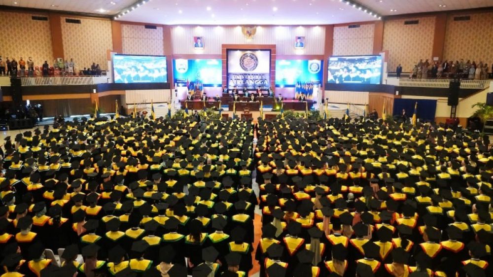 SURABAYA | B-news.id - Gubernur Jawa Timur Khofifah Indar Parawansa sebagai Ketua Prngurus Pusat Ikatan Alumni UNAIR memberikan motivasi pada 1.320 wisudawan Universitas Airlangga di Gedung Airlangga Convention Center Kampus C Universitas Airlangga, Sabtu (4/3).