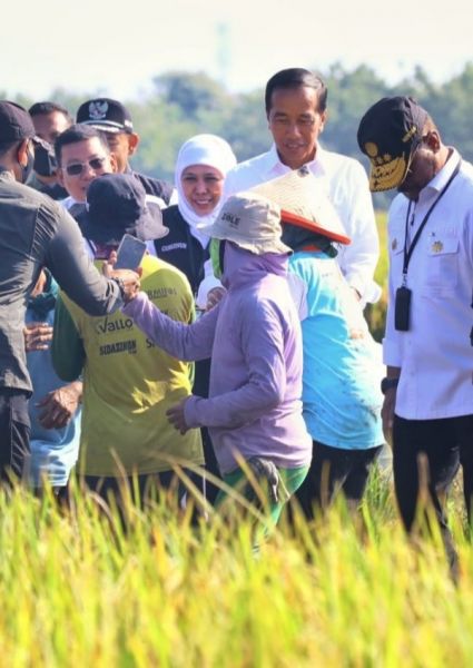 Presiden Jokowi didampibgi Gubernur Khofifah menyapa para ibu-ibu buruh tani. (Ist(