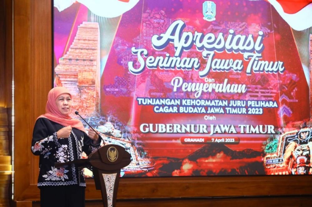 SURABAYA | B-news.id - Gubernur Jawa Timur Khofifah Indar Parawansa memberikan apresiasi dan tunjangan kehormatan pada 1.000 seniman dan 240 juru pelihara cagar budaya Jatim, di Gedung Negara Grahadi, Jumat (7/4/2023).