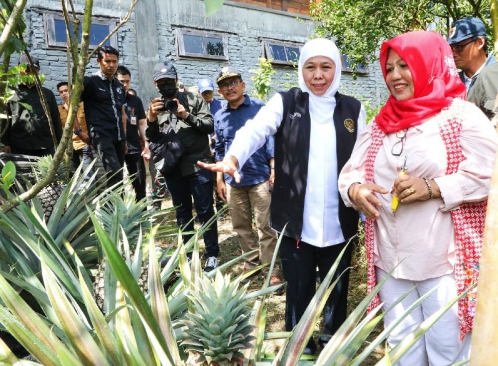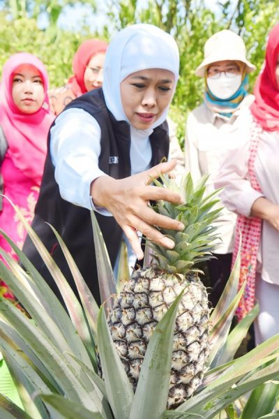 Setibanya di kebun buah organik, Gubernur Khofifah memetik langsung berbagai buah seperti nanas madu jumbo, jeruk dan alpukat.