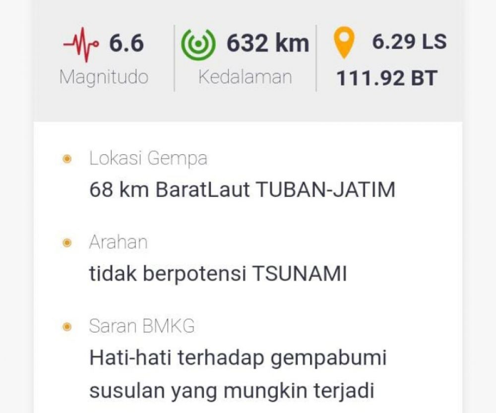 Hasil penelusuran jurnalis B-news.id, dilansir dari laman resmi Badan Meteorologi Klimatologi dan Geofisika (BMKG) menyebutkan, pusat gempa terjadi di 68 km barat laut Tuban, Jawa Timur, dengan magnitudo 6,6 pada skala richter.