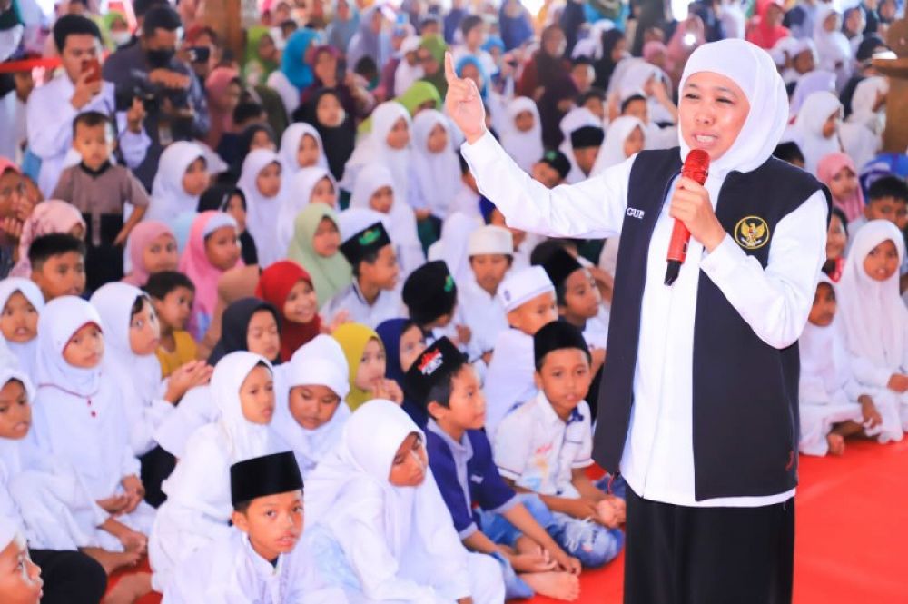 "Gantungkanlah cita-cita kalian setinggi langit, karena bila terjatuh akan jatuh di antara bintang-bintang," ujar Gubernur Khofifah memotivasi anak-anak yatim/piatu.