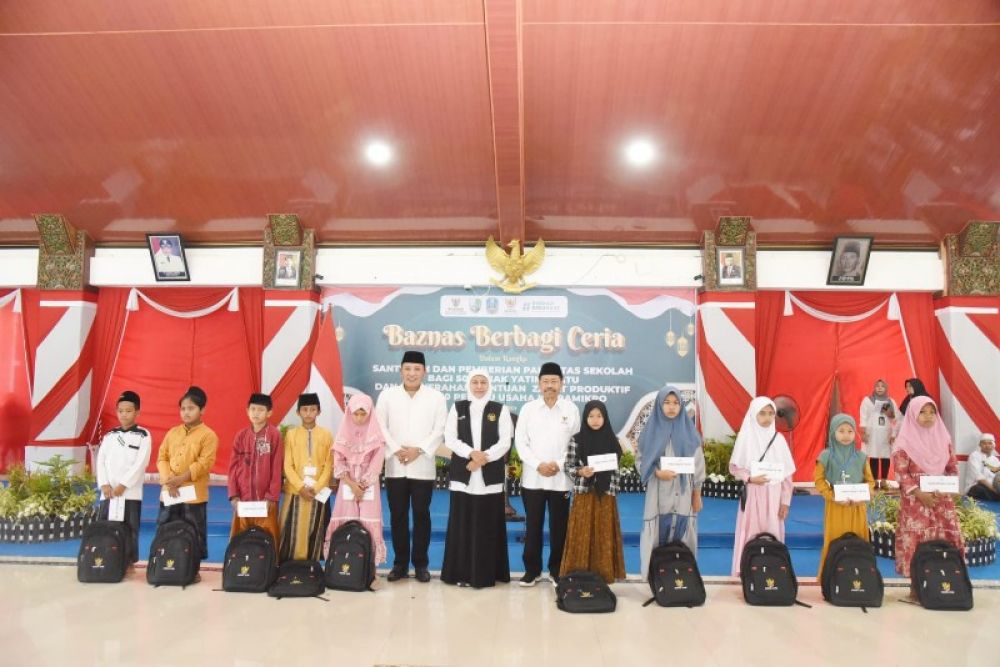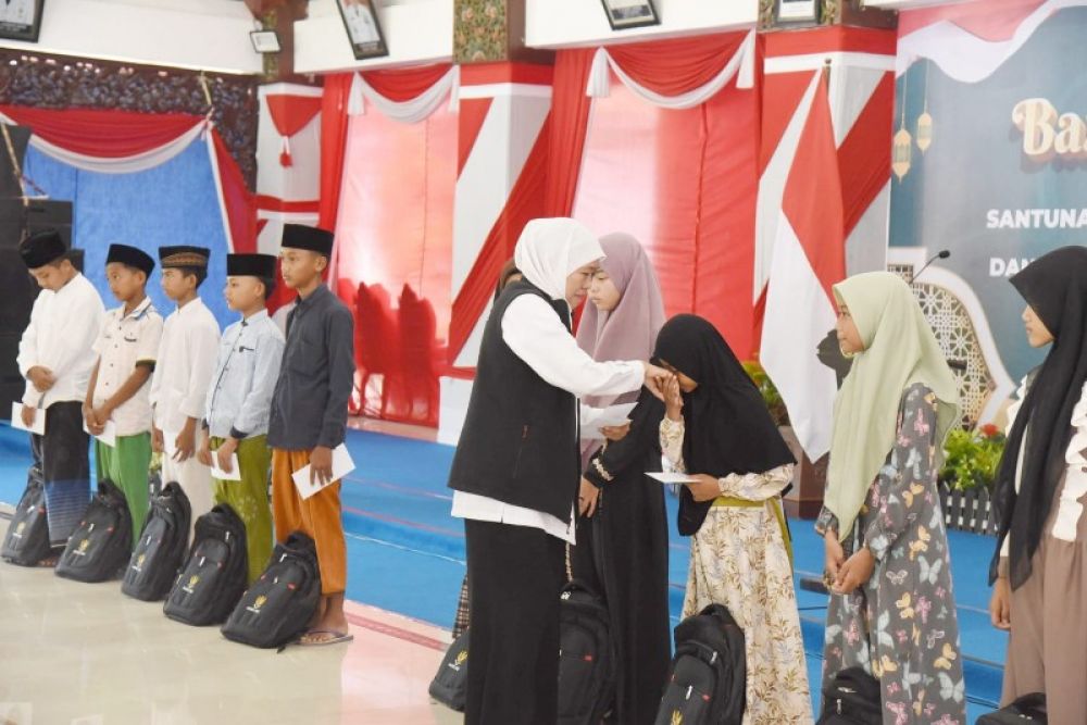 SAMPANG | B-news.id - Gubernur Jawa Timur Khofifah Indar Parawansa bersama Badan Amil Zakat Nasional (Baznas) Jatim menyalurkan santunan dan pemberian paket tas sekolah bagi 500 anak yatim piatu di Pendopo Trunojoyo Kabupaten Sampang, Rabu (19/4).