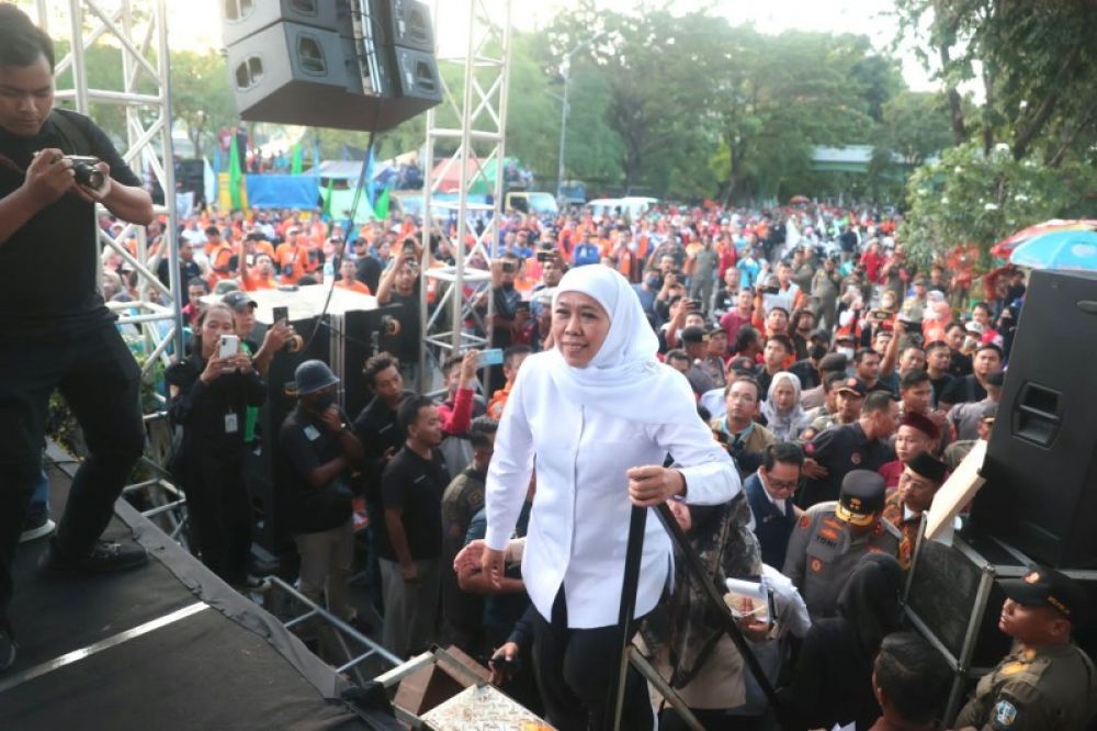 Gubernur Khofifah menyampaikan sambutan menerima ribuan kaum buruh. (Ist)