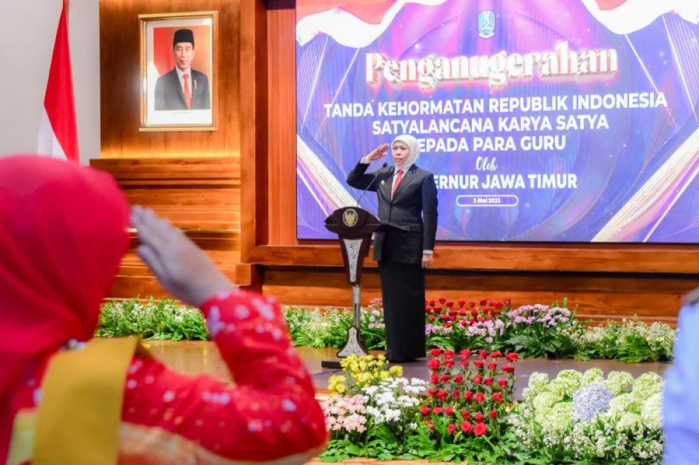 Dan Gubernur Khofifah ingin menyematkan tanda kehormatan tersebut secara langsung kepada seluruh guru penerima sebagai bentuk rasa hormat kepada para guru.