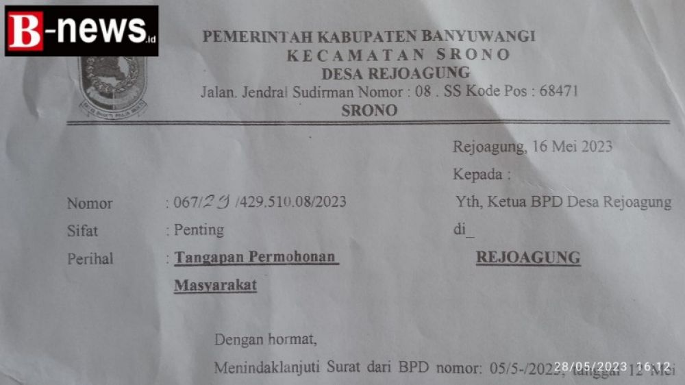Surat bernomor : 067/29/429.510.08/2023 bertajuk Tanggapan Permohonan Masyarakat yang ditandatangani oleh Kades Rejoagung dan ditujukan kepada BPD Rejoagung seolah melempar kesalahan kepada pihak ketiga.