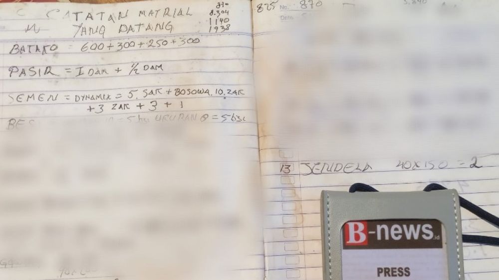 Selain batako, diketahui selisih kekurangan dari bahan material yang datang dengan yang tercantum di DRPB antara lain terdapat, Semen, pasir, besi beton dan kayu.