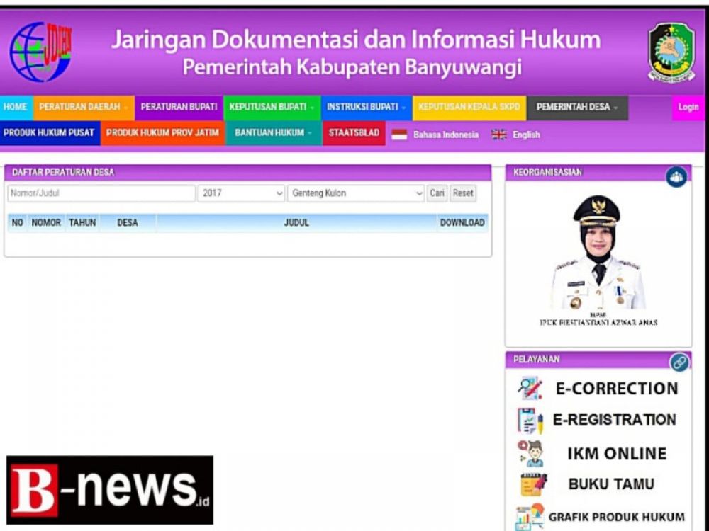 Penelusuran Jurnalis B-news.id mengarah pada laman resmi JDIH Pemkab Banyuwangi, namun tak menemukan Perdes Genteng kulon Nomor 2 Tahun 2017. (Irw)