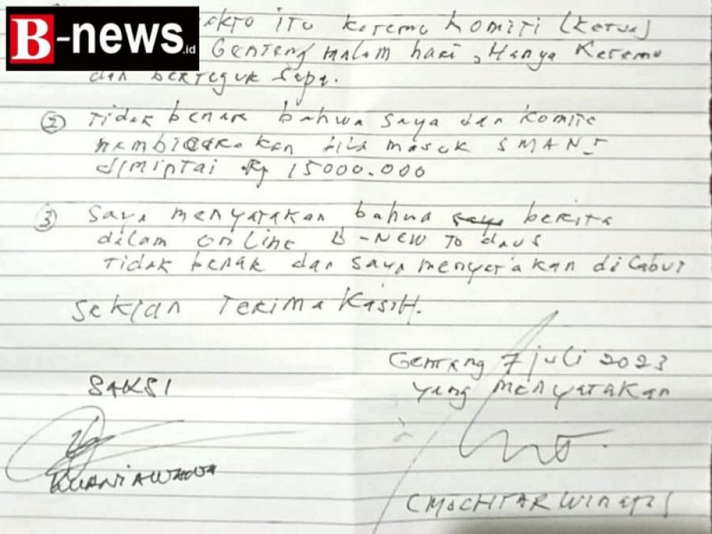 Mencermati isi Surat perantara tertanggal 7 Juli 2023 itu terdapat 3 point didalamnya, Pertama, Mochtar Winata menyatakan benar pernah bertemu Ketua Komite Sekolah SMAN 1 Genteng dan hanya untuk bertegur sapa.
