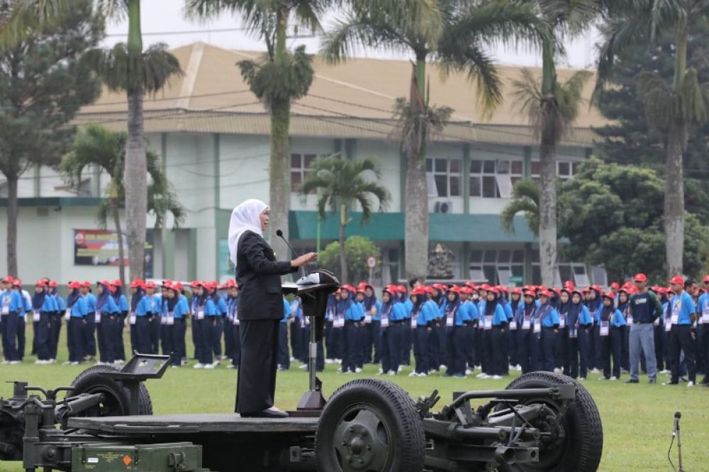 KOTA BATU | B-news.id - Gubernur Jawa Timur Khofifah Indar Parawansa menjadi Inspektur Upacara (lrup) dalam pembukaan Kegiatan Cinta Sekolah (KCS) 2023 Cita Garda Nawasena yang diikuti oleh 978 siswa SMK PGRI 3 Malang di Lapangan Arhanud, Kota Batu, Senin (10/7).