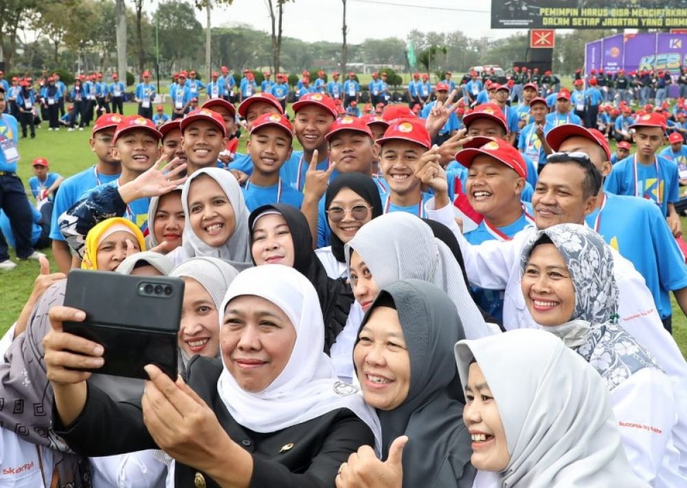 Para siswa berebut selfi dengan Gubernur Khofifah. (Ist)