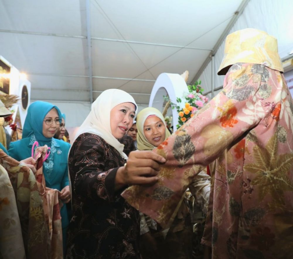 Usai penyerahan penghargaan, Gubernur Khofifah dan Ketua TP PKK Jatim Arumi bersama-sama melakukan peninjauan stand pameran yang berlokasi di depan pendopo. Jumlah stand yang ikut menyemarakkan pameran berjumlah 52 stand. (zainul)