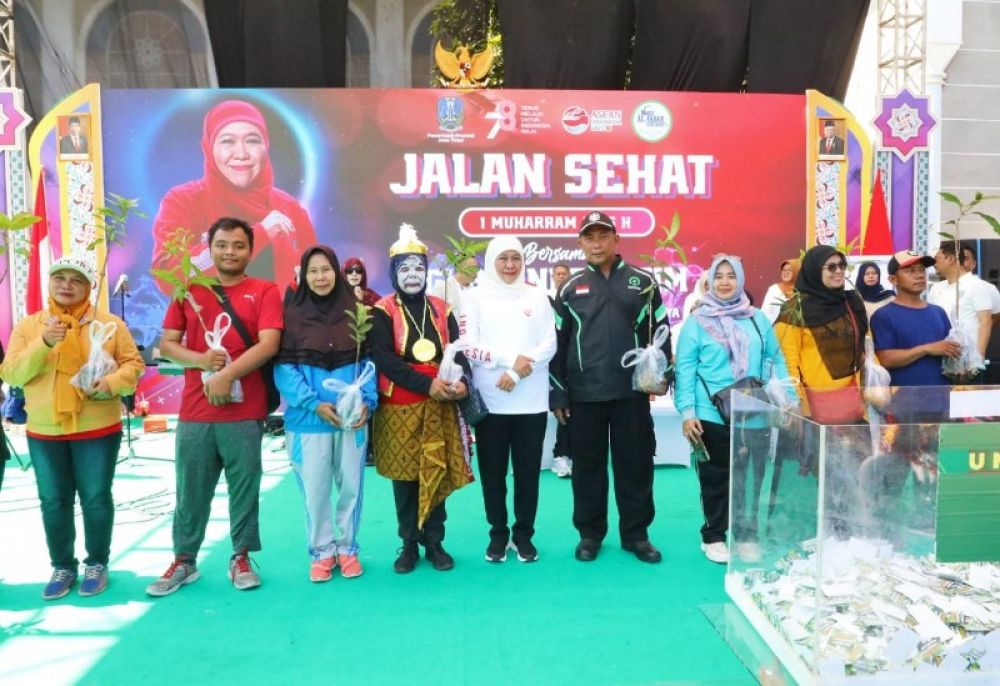 SURABAYA | B-news.id - Gubernur Jawa Timur Khofifah Indar Parawansa membagikan 1.445 bibit pohon secara gratis pada masyarakat dalam gelaran Jalan Sehat 1 Muharram 1445 H di halaman Masjid Nasional Al-Akbar Surabaya (MAS), Rabu (19/7).