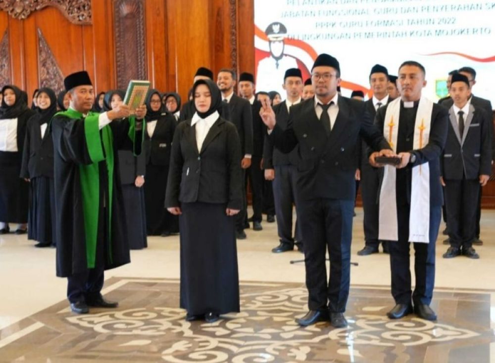 KOTA MOJOKERTO | B-news.id - Wali Kota Mojokerto Ika Puspitasari melantik 90 pejabat Fungsional ASN guru di ruang Mandala Madya Balai Kota Mojokerto, Selasa (18/7) siang. Bertepatan dengan acara pelantikan tersebut diserahkan 129 petikan keputusan pengangkatan calon Pegawai Pemerintah dengan Perjanjian Kerja (P3K) guru.